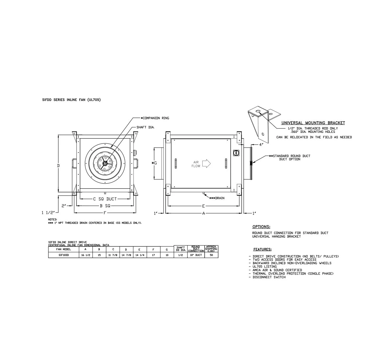 Disconnect switch, mounting brackets, fan speed control, and round inlet and outlet connections included. The fan can accept square or round ductwork connections.
