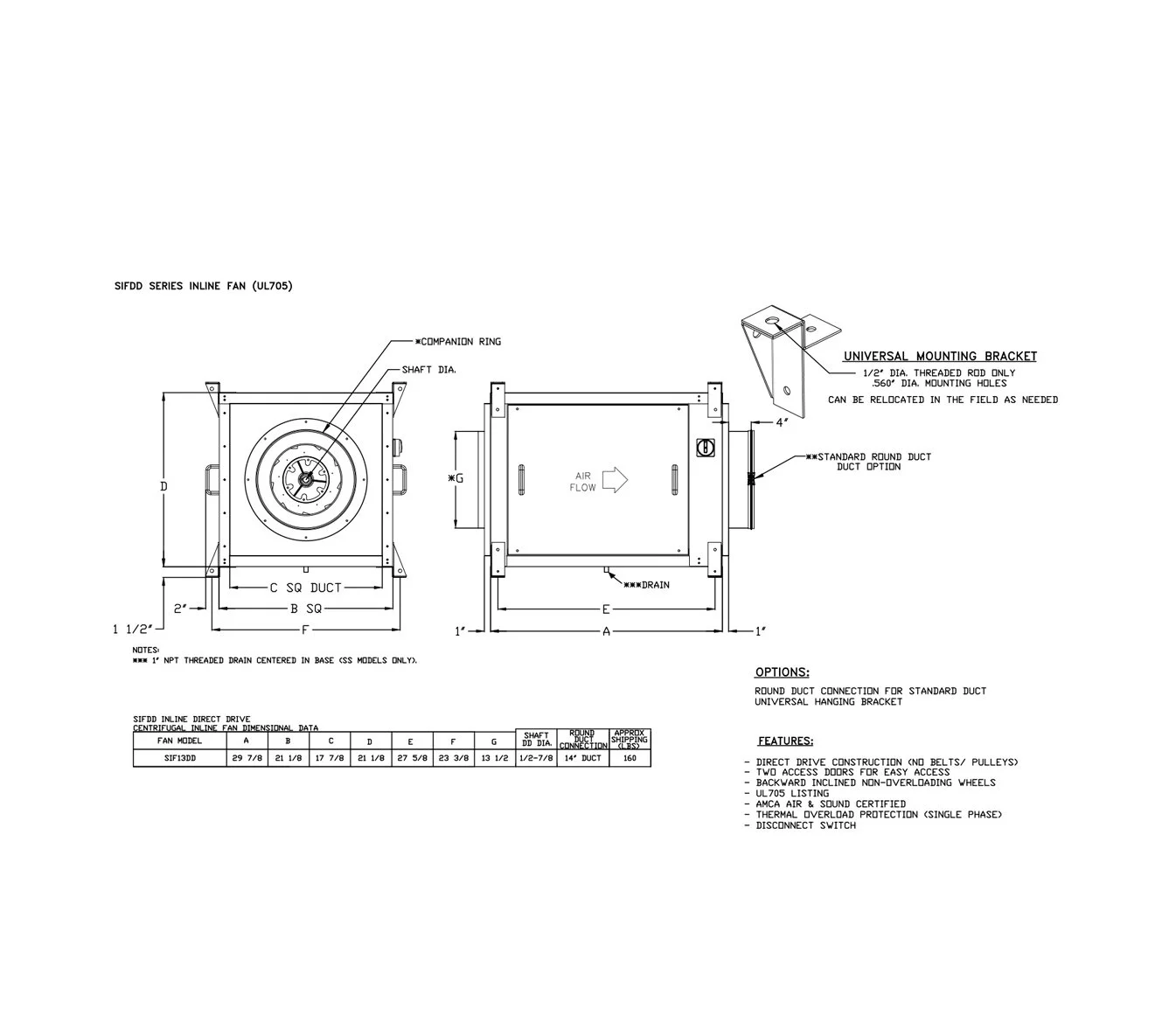 Disconnect switch, mounting brackets, fan speed control, and round inlet and outlet connections included. The fan can accept square or round ductwork connections.