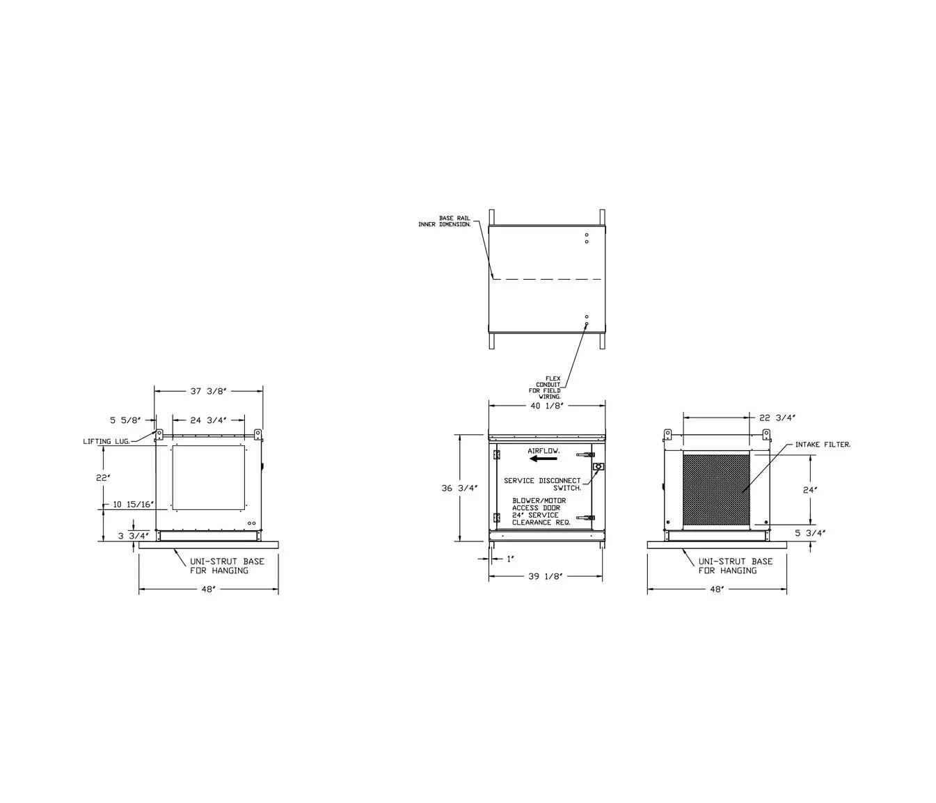 Disconnect switch. Service doors on both sides. Metal mesh filter. Indoor Hanging Cradle. Horizontal discharge.
