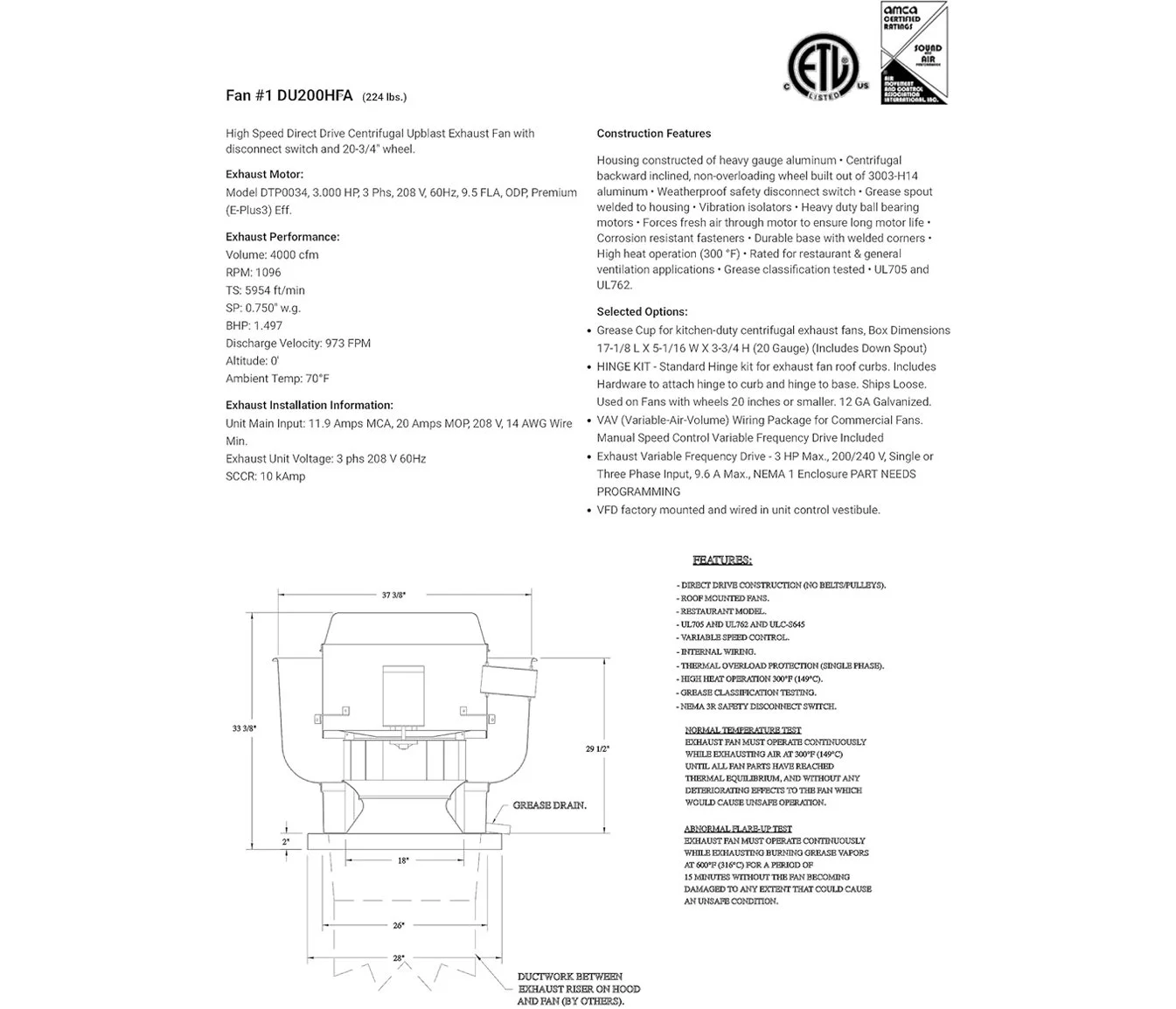 Rated for restaurant grease and general ventilation applications. UL705, UL762, & ULC-S645 Rated. Included with the exhaust fan is a restaurant duty grease cup, down spout, and a hinge kit for exhaust fan roof curbs.