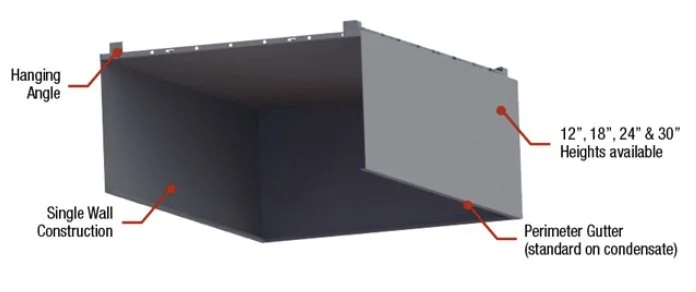 Condensate Applications: Integral 4-sided perimeter gutter and one drain standard for high-moisture exhaust.
